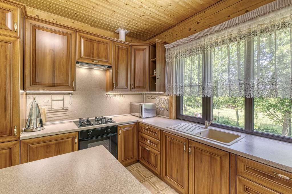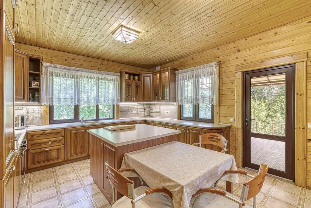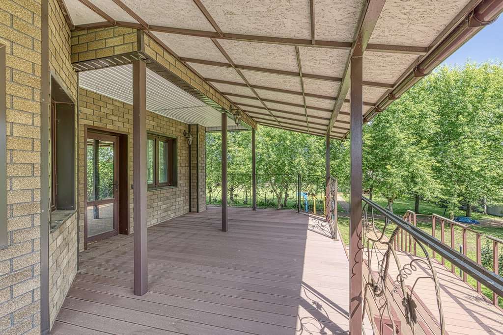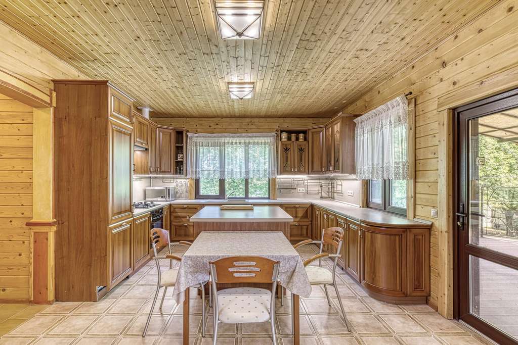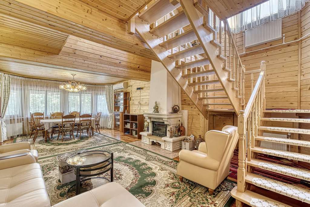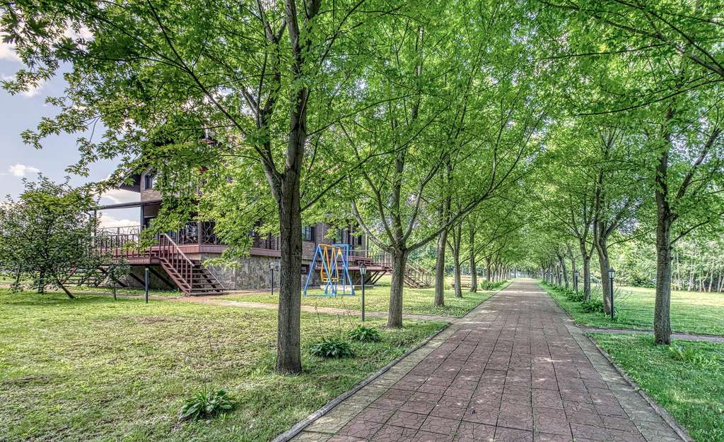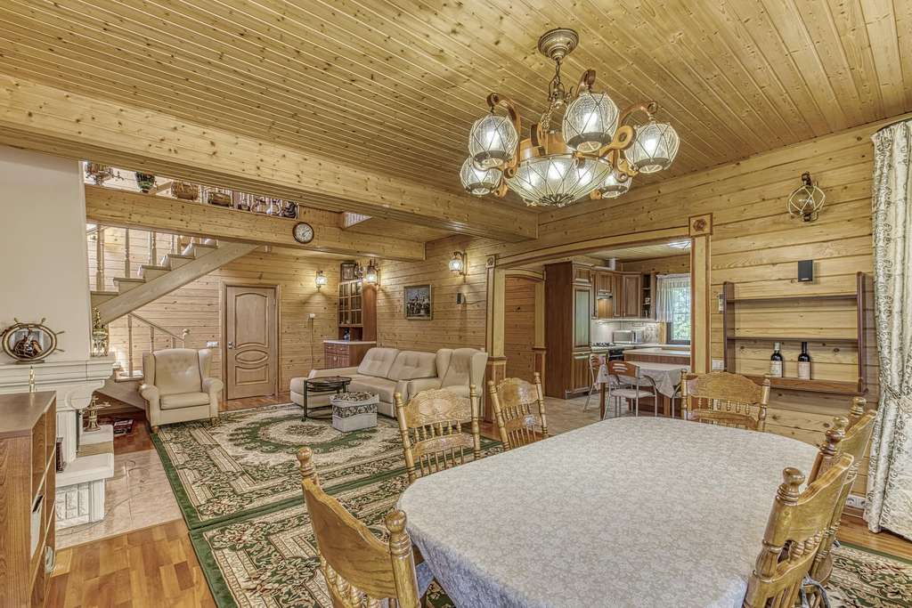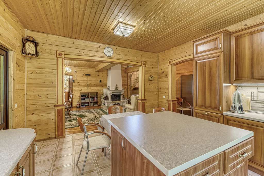 На участках расположен большой хозяйский дом, выполненный из бруса. К дому ведет кленовая аллея. Дом полностью утеплен и реставрирован 5 лет назад. Большая кухня-гостиная с выходом на террасу и камином, три спальни и три санузла.